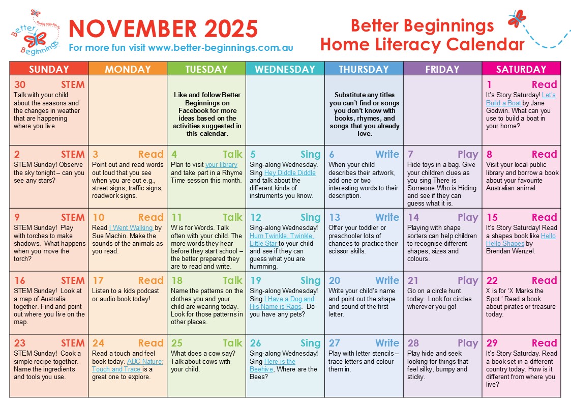 Better Beginnings encourages all families to Read, Talk, Sing, Write and Play with their child every day, but sometimes it can be hard to think of things to do. Better Beginnings is here to help! Our Home Literacy Calendar is packed full of fun, easy things you can do together at home that will help develop your child’s early literacy skills and turn your child into a reader. Print it out and stick it on your fridge for some daily inspiration!